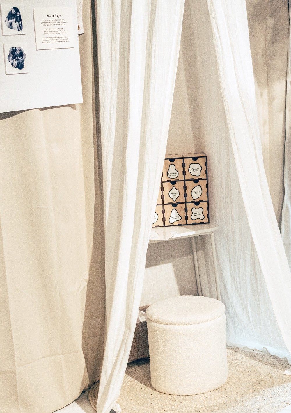 The design is shaped by the belief that material carries meaning. Every element was chosen for symbolic and emotional resonance: the circular form of the altar echoes grief circles and communal holding. Soft textures (felt and muslin) offer comfort where tenderness is required. Earth-based materials (seed paper, soil, wood, dried florals, ceramic clay) speak to the natural cycles of loss and renewal. Scent supports the nervous system along the ritual arc: Frankincense for warmth and grounding, Hinoki for emotional release and breath, Ho Wood for gentle uplift as you depart. This work is the first seed in an ongoing exploration of grief, sensory design, and experiential space-making.